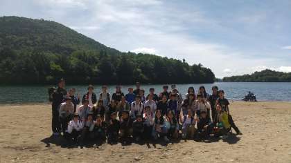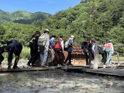 宿舎から約1時間バスに乗り、奥日光湯元に9時に到着しました。いろは坂を登り、標高は、1500m近くになり、とても涼しいです。バスを降り、源泉に行きました。辺りには硫黄の匂いが立ち込め、温泉地の風情が感じられました。その後、湯の湖畔に行き、クラス写真を撮りました。