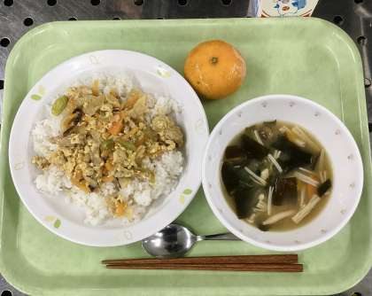 今日は、他人丼、わかめのみそ汁、冷凍みかん、牛乳です。