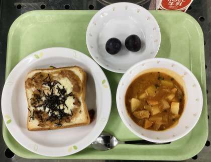 今日は、照り焼きチキンピザトースト、ハンガリアンシチュー、巨峰、牛乳です。