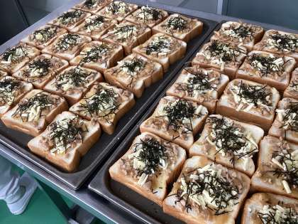 甘辛く味付けした鶏肉をパンにのせ、チーズと海苔をかけて焼き上げました。