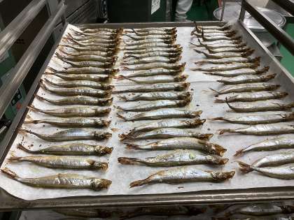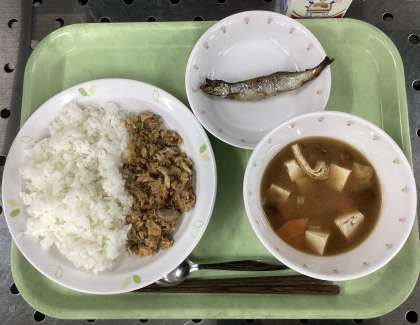 今日は、さばそぼろ丼、ししゃもの香味焼き、なめこと豆腐のみそ汁、牛乳です。