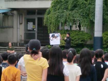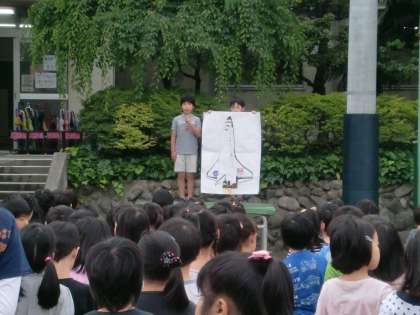 今日の6年生のスピーチは、スペースシャトルとおもしろい虫のお話でした。絵が上手に描かれ、子どもたちは興味深く聞いていました。朝会が終わると、学年ごとに各昇降口に移動しますが、いつもきちんと行進しています。いつも感心しています。