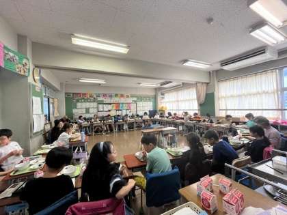 授業後に、給食を一緒に食べました。「昔はパンばかりだったのよ。」と、昔の給食の違いも教えてもらいました。