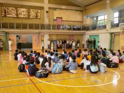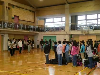 校庭の地面がしめっているので、体育館で出発式を行いました。多くの保護者に見守れながら元気に出発しました。全員参加で、天気予報もよさそうなので、無事予定通りに進むことを願っています。では、5年生のみんな、行ってらっしゃい。