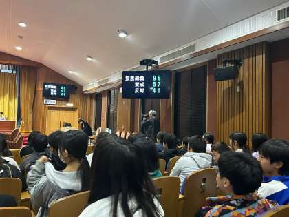 国会議事堂では、参議院特別体験プログラムに参加しました。全員が国会議員となり、法案を検討し、賛成・反対ボタンで法案を可決しました。代表児童は、議長や委員になってセリフを言ったりして疑似体験をしました。実際の国会の雰囲気を味わえた貴重な体験をすることができました。