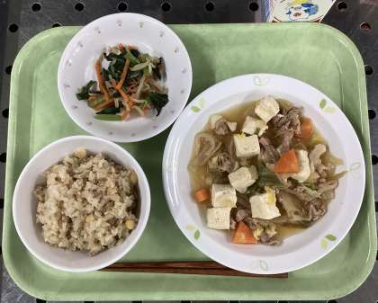 今日は、豆そぼろごはん、肉豆腐、小松菜のおひたし、牛乳です。