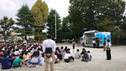 地域防災課から起震車についてのお話があり、教員による起震車模範体験もありました。