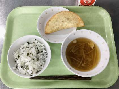 今日は、わかめごはん、ジャンボぎょうざ、コーンともやしのスープ、牛乳です。