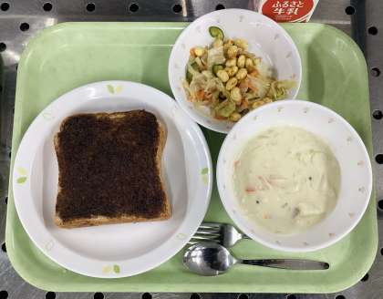 今日は、胚芽ココアトースト、カレービーンズサラダ、クリームシチュー、牛乳です。