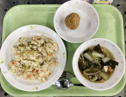 今日は、じゃこチャーハン、中華スープ、さつまいも入りごま団子、牛乳です。