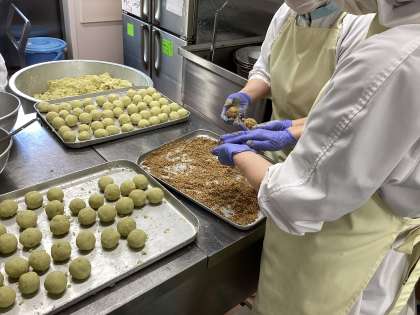 ごま団子は、さつまいもを加熱してから潰し、白玉粉や上新粉と合わせて生地を作ります。