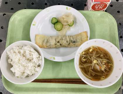 今日は、麦ごはん、棒餃子、大根ときゅうりのごま風味、豆もやしのスープ、牛乳です。