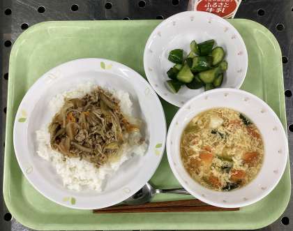 今日は、豚丼、きゅうりの南蛮漬け、かきたま汁、牛乳です。