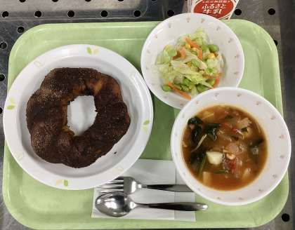 今日は、たてがみココアあげパン、バジルドレッシングサラダ、トマトとポテトのスープ、牛乳です。