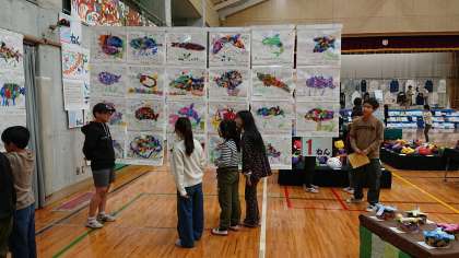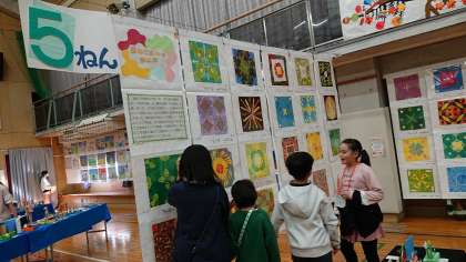 3・4年生は、各展示場所を回って、5・6年生から作品の見どころや思いなどを聞きました。