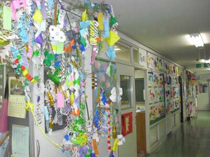 1年生の教室前の廊下は七夕かざりで華やかです。