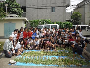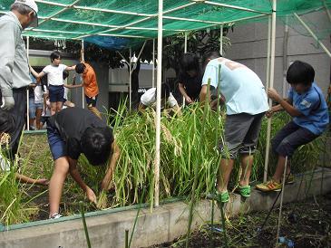 9月26日 さわやかな秋空の下、農協の方がご指導してくださり、たわわに実った稲を刈りました。