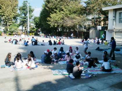 班ごとに集まって、校庭、体育館、屋上で食べ、