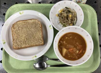 今日は、セサミトースト、小松菜とウインナーのソテー、ビーンズシチュー、牛乳です。