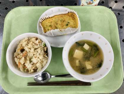 今日は、きのこごはん、切り干し大根の卵焼き、じゃがいもと豆腐のみそ汁、牛乳です。