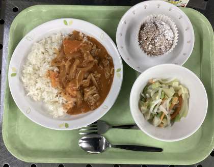 今日は、ポークストロガノフ、枝豆サラダ、シュトーレン風ケーキ、牛乳です。