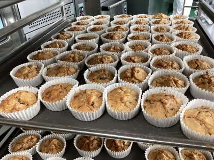 今日は、レーズンやりんごなどの具材を入れ、シナモンで香りを付けて焼き上げました。