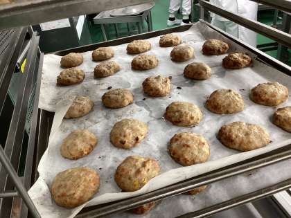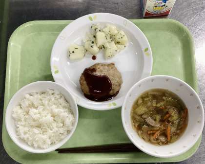 今日は、有機米ごはん、おみくじバーグ、パセリポテト、白菜のスープ、牛乳です。