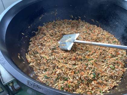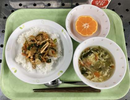 今日は、豚キムチ丼、大根入りかきたま汁、菊花みかん、牛乳です。