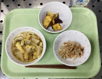 今日は、目の教室の大根カレーうどん、大根おかかサラダ、大学いも、牛乳です。