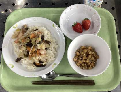 今日は、中華丼、大豆とじゃこの甘辛あげ、いちご、牛乳です。