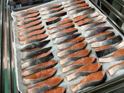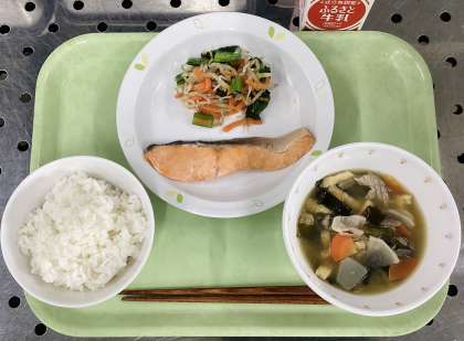 当時の献立は「おにぎり、焼き魚、漬物」でした。今日の給食では、栄養バランスを考え、豚汁と牛乳、おひたしにはしらすを入れています。