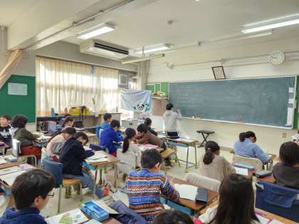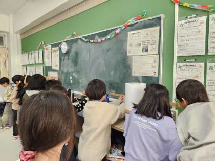 子どもたちは、教室にあるものの長さを班の友達と協力して測ります。