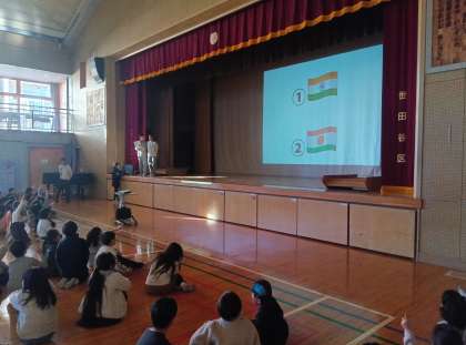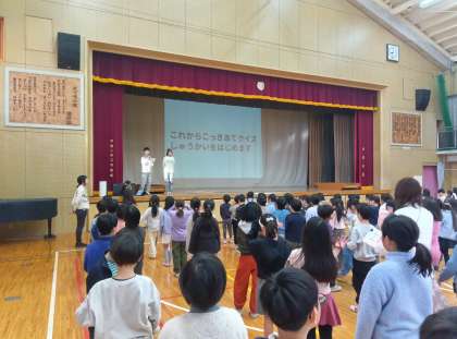 今日の集会は、集会委員会による「こっきあてクイズしゅうかい」でした。司会の人が国名を言い、その国の国旗を3つの中から選ぶクイズでした。集会委員のみなさんが作った架空のデザインの国旗も、選択肢に入っていて、それを見るのも楽しかったです。スポーツの国際大会などで、世界の国々の国旗も見慣れているようで、正解する子が多く、体育館は大盛り上がりでした。