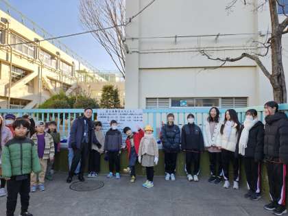 桜丘中学校の生徒が笹原小学校のあいさつキッズ3年生と一緒に正門であいさつをして元気な1日のスタートを手伝ってくれています。