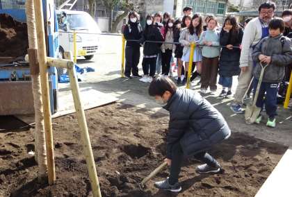 6年生が代表で、川端造園さんが準備してくれたポプラの木にスコップで土をかけました。
