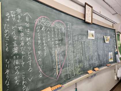 「太郎はどんな心の持ち主なのか」という担任の問いに子どもたちは、「やさしい」「子どもへの心が広い」「命にかかわることに必死」「みんなを思う心がある」など挙げていきました。
