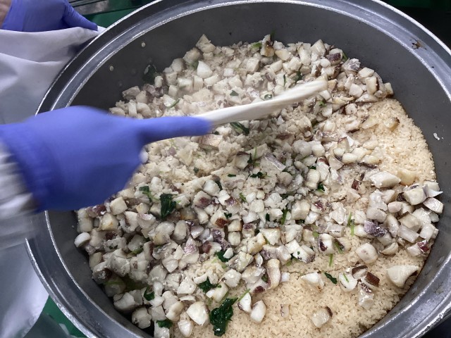 身は、オーブンで焼き、炊けたごはんに混ぜ込んでいます。