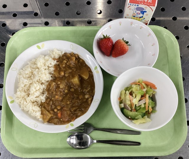 今日は、カレーライス、コールスローサラダ、いちご、牛乳です。