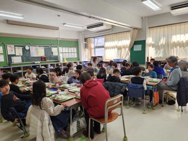 今日は、4校時に地域の方と一緒に昔遊びをした流れで給食交流もしました。