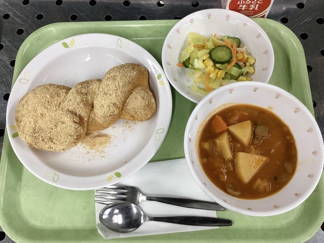 今日は、きな粉あげパン、キャベツサラダ、トマトシチュー、牛乳です。
