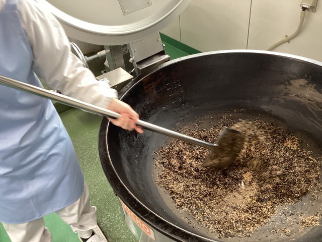 今日は塩昆布とひじき、鰹節、ごまを釜で炒り、醤油で風味づけをしています。
