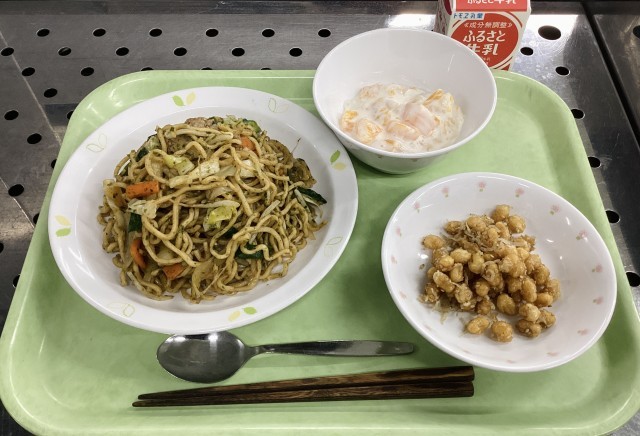 今日は、ソース焼きそば、大豆とじゃこの甘辛あげ、フルーツヨーグルト、牛乳です。