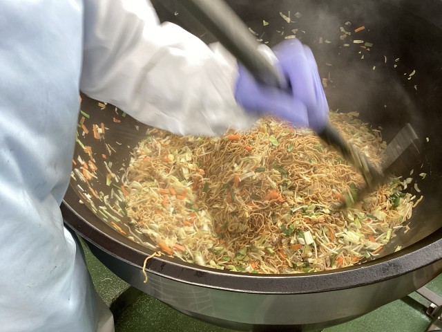 ソース焼きそばは、麺をあらかじめスチームコンベクションオーブンで加熱し、炒めた野菜と合わせ、とんかつソースやウスターソース、塩こしょうなどで味付けして作ります。
