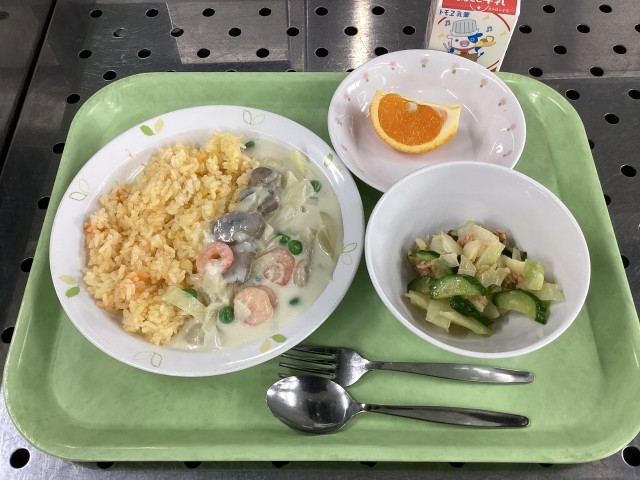 今日は、えびの米粉クリームライス、ツナと米粉マカロニのサラダ、清見オレンジ、牛乳です。