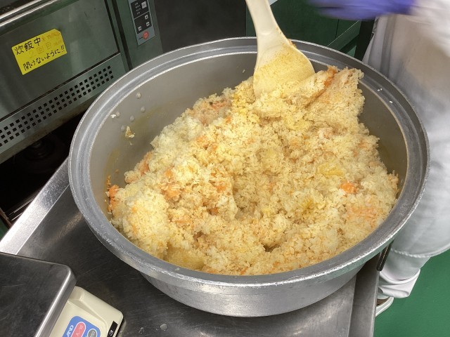 えびの米粉クリームライスのごはんには、すりおろしたにんじんを入れています。