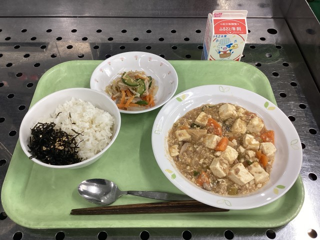 今日は、ごはん、韓国のり風ふりかけ、西湖豆腐、こんにゃくサラダ、牛乳です。