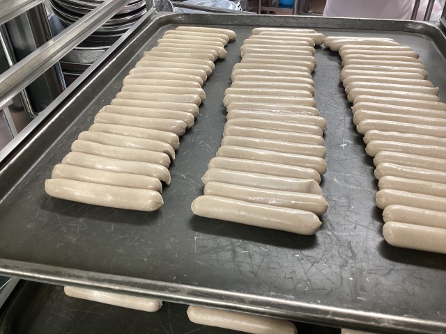 今日は、セルフチリドッグ、ポテトコーンポタージュ、フルーツポンチ、牛乳です。