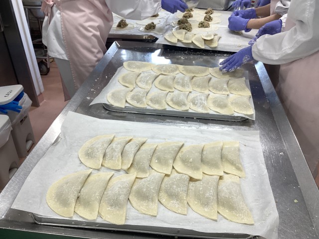 運動会応援給食として、スタミナがつく食材(豚肉、にら、にんにくなど)が入ったジャンボぎょうざを作りました。