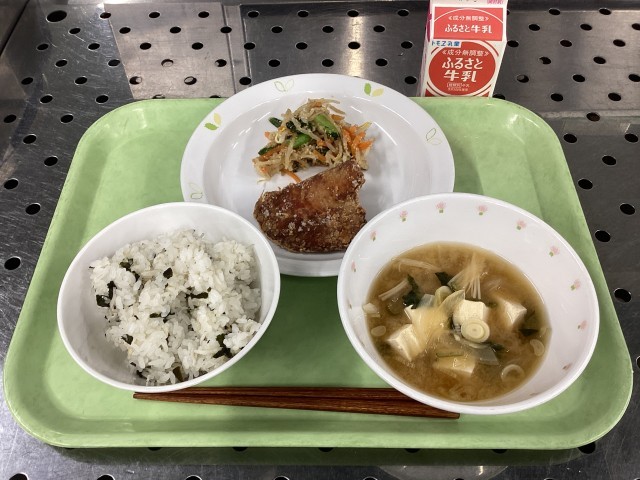 今日は、わかめとじゃこのごはん、自分に勝つ!かつおの竜田揚げ、ごまあえ、豆腐のみそ汁、牛乳です。