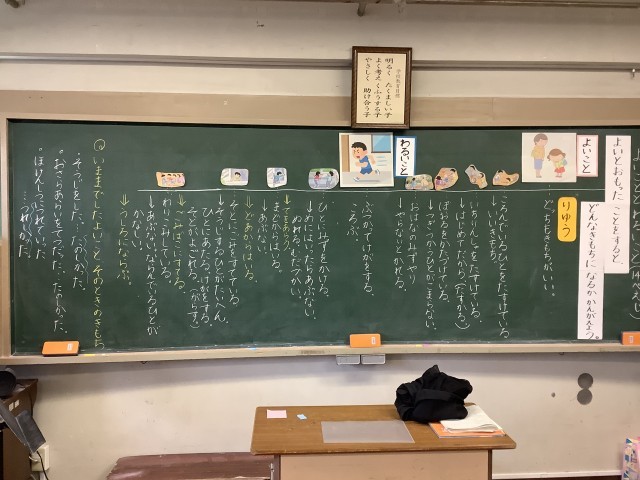 「よいとおもったことをすると、どんなきもちになるか かんがえよう」というめあてをもち、教科書に描かれている良い行い・悪い行いをペアで見付けて、発表しました。